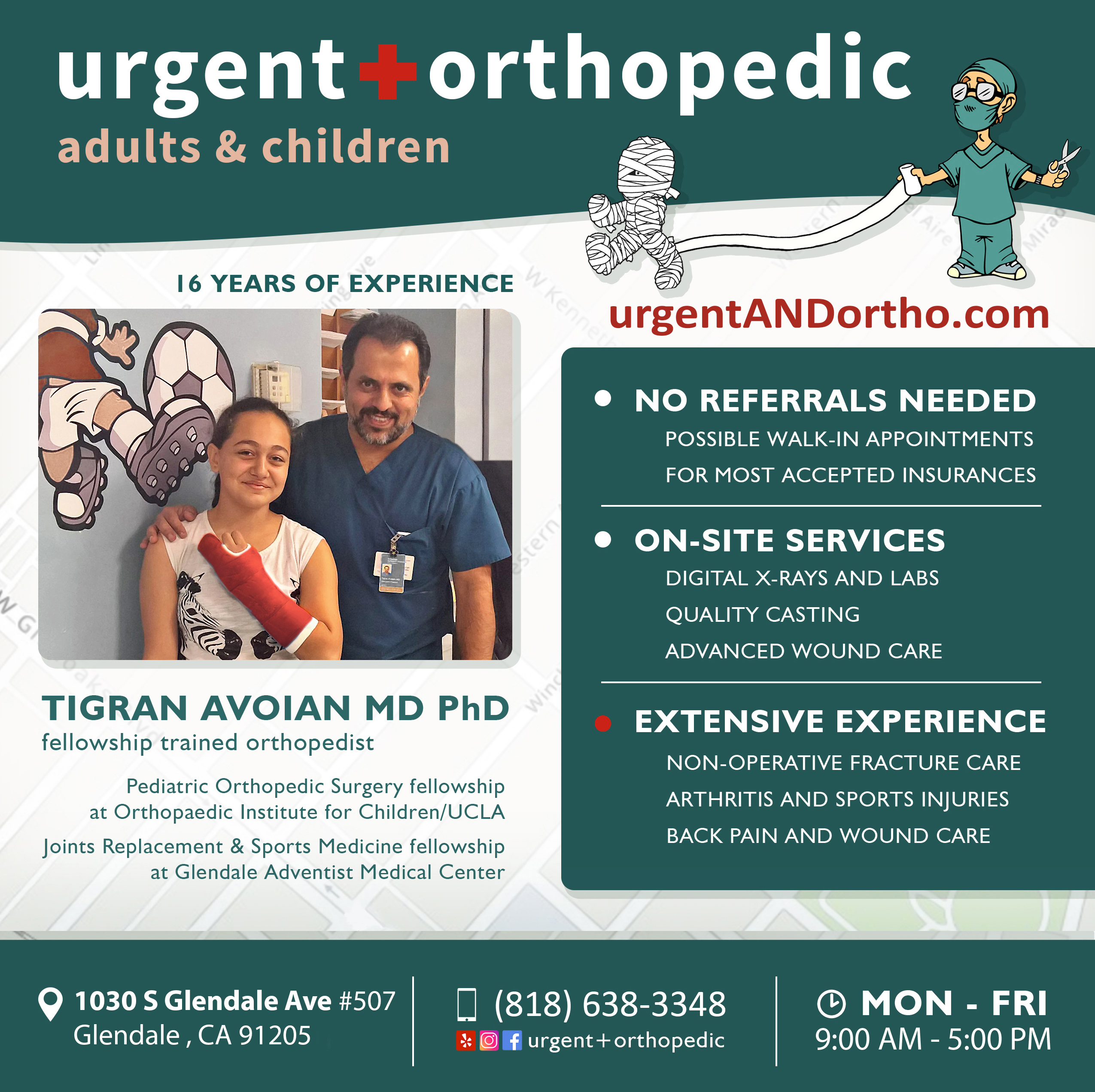 Our goal is to create a one stop, WALK-IN go-to SPOT for ORTHOPEDIC patient of all ages, to provide DIRECT and immediate CARE of ORTHOPEDIC PATIENTS for best possible results and patient's convenience . We are recognized for impressive experience and skillful orthopedic non-operative treatment particularly non-operative fracture care. We aim to treat you like a family and be with you through evaluation to recovery.